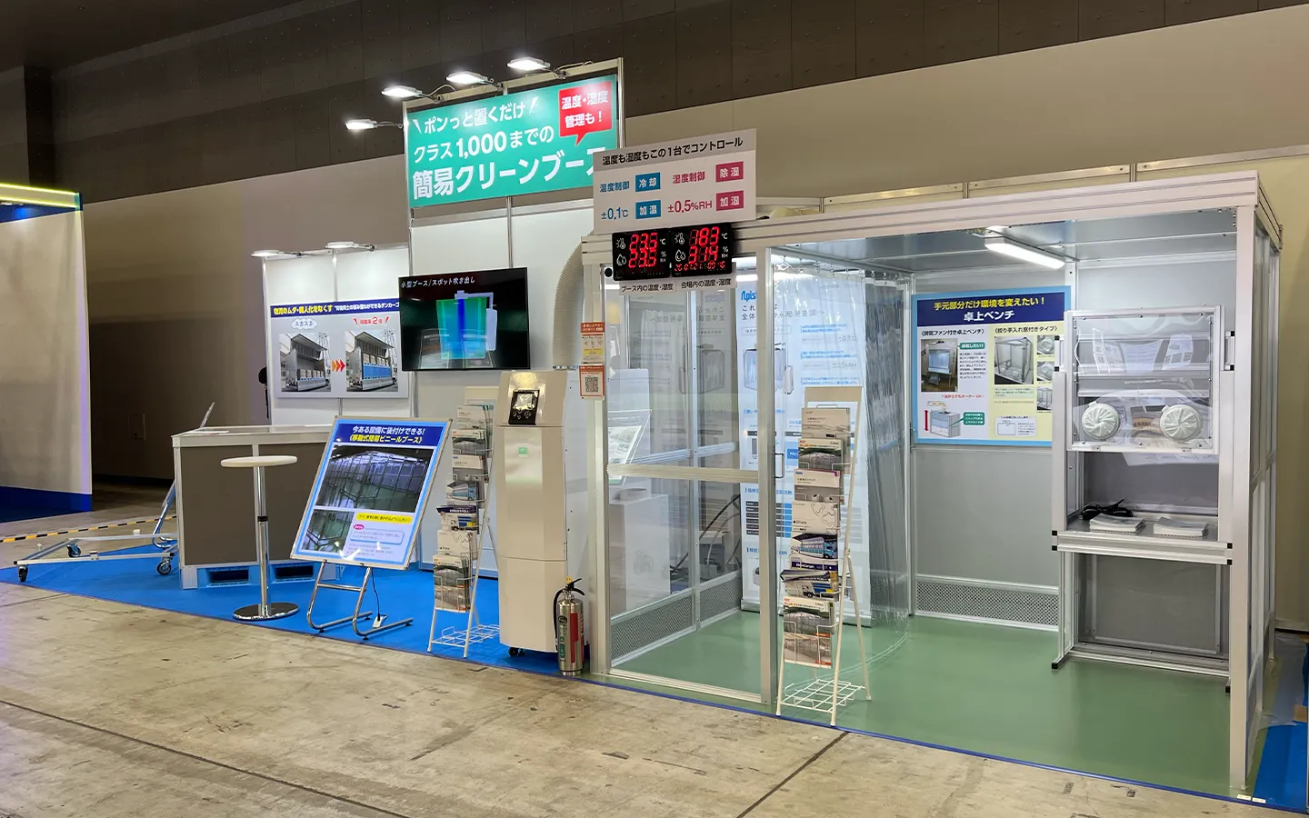 昨年に続き、21日から23日まで東京ビッグサイトで開催されている『ネプコンジャパン』という半導体系の展示会に出展し、精密空調機メーカーのA社と当社のパネル式ルーム構造を組み合わせた“ポンっと、置くだけ感覚の簡易クリーンブース”をPRしています。